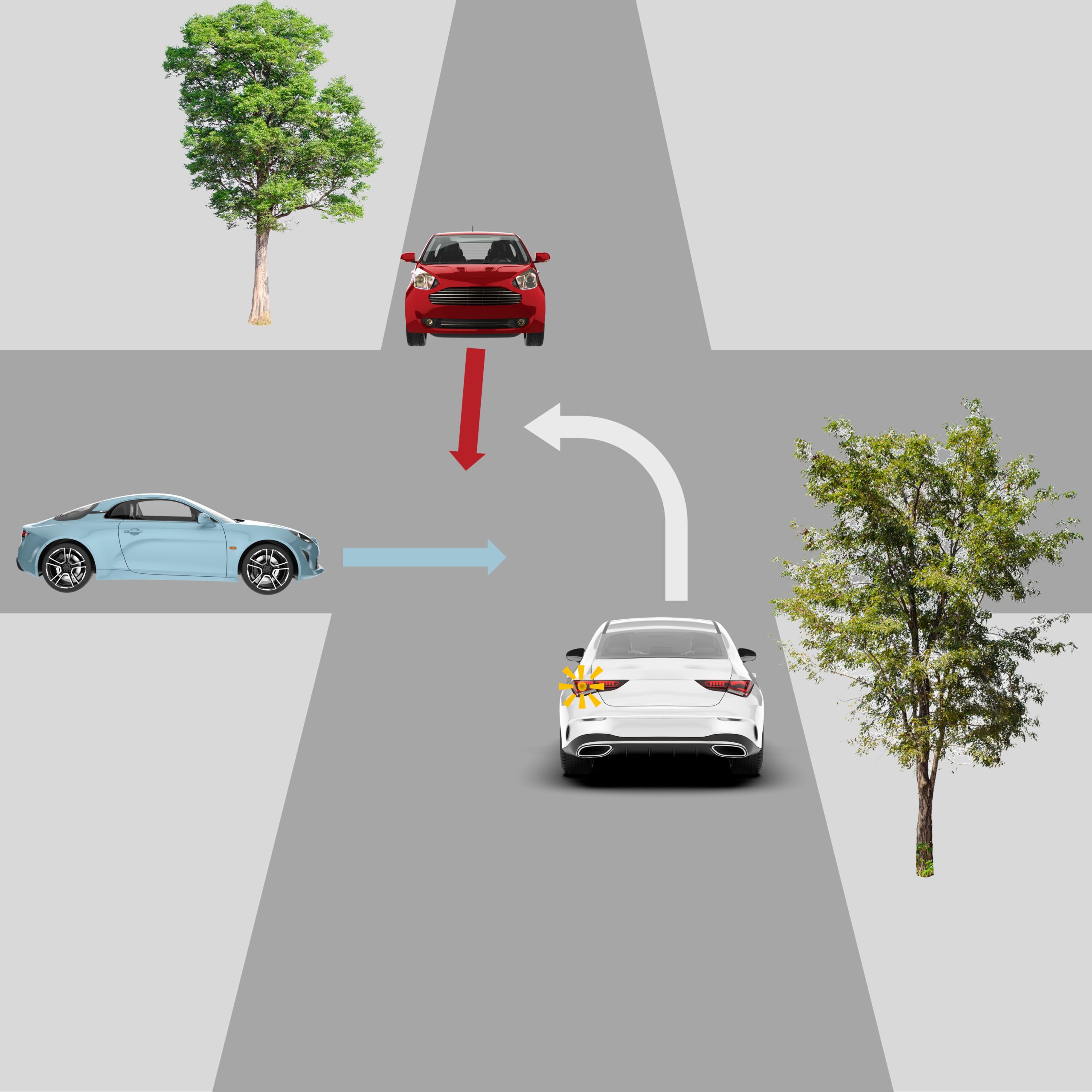 Let’s take a classic example with three vehicles: a white car, a red car, and a blue car meet at such an intersection. The white car wants to turn left, the red car is directly opposite, and the blue car is to the left of the white car (see image). And now, the dance begins: